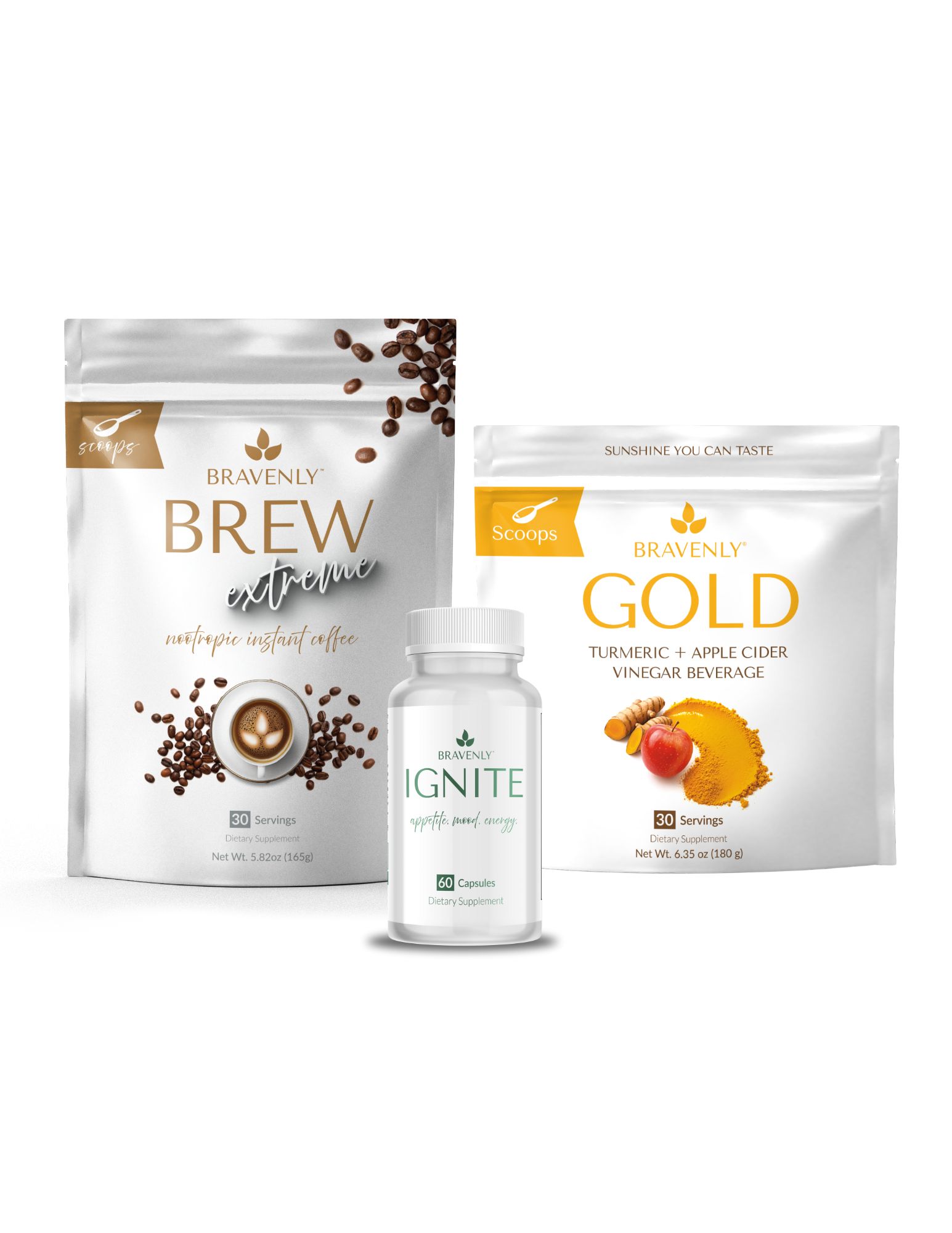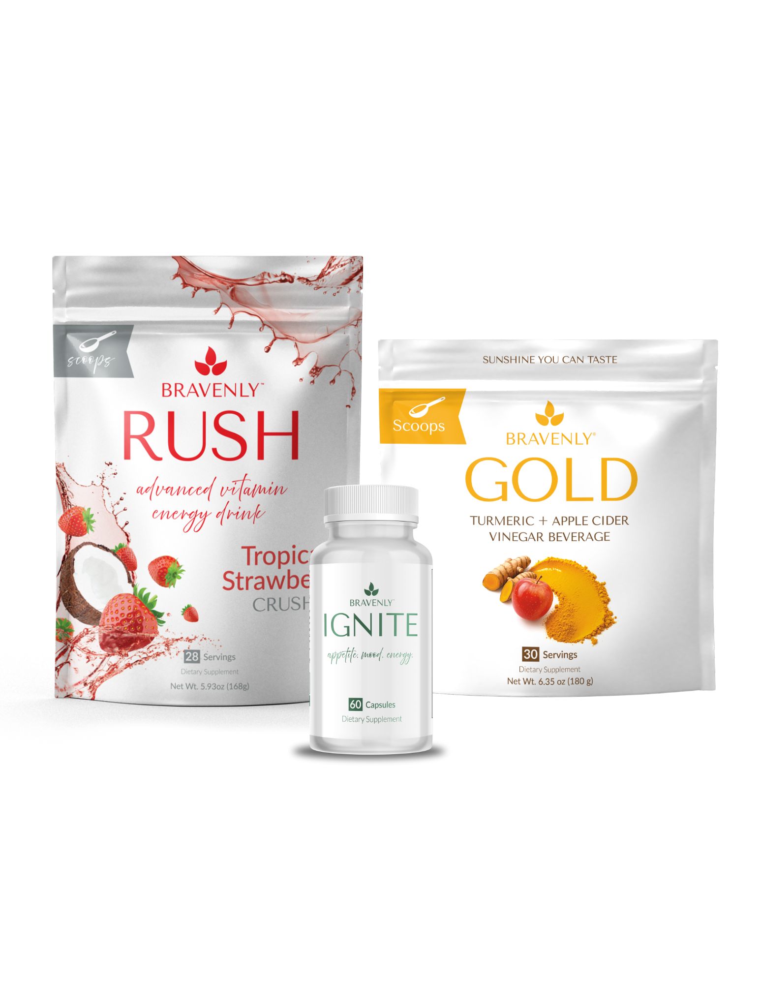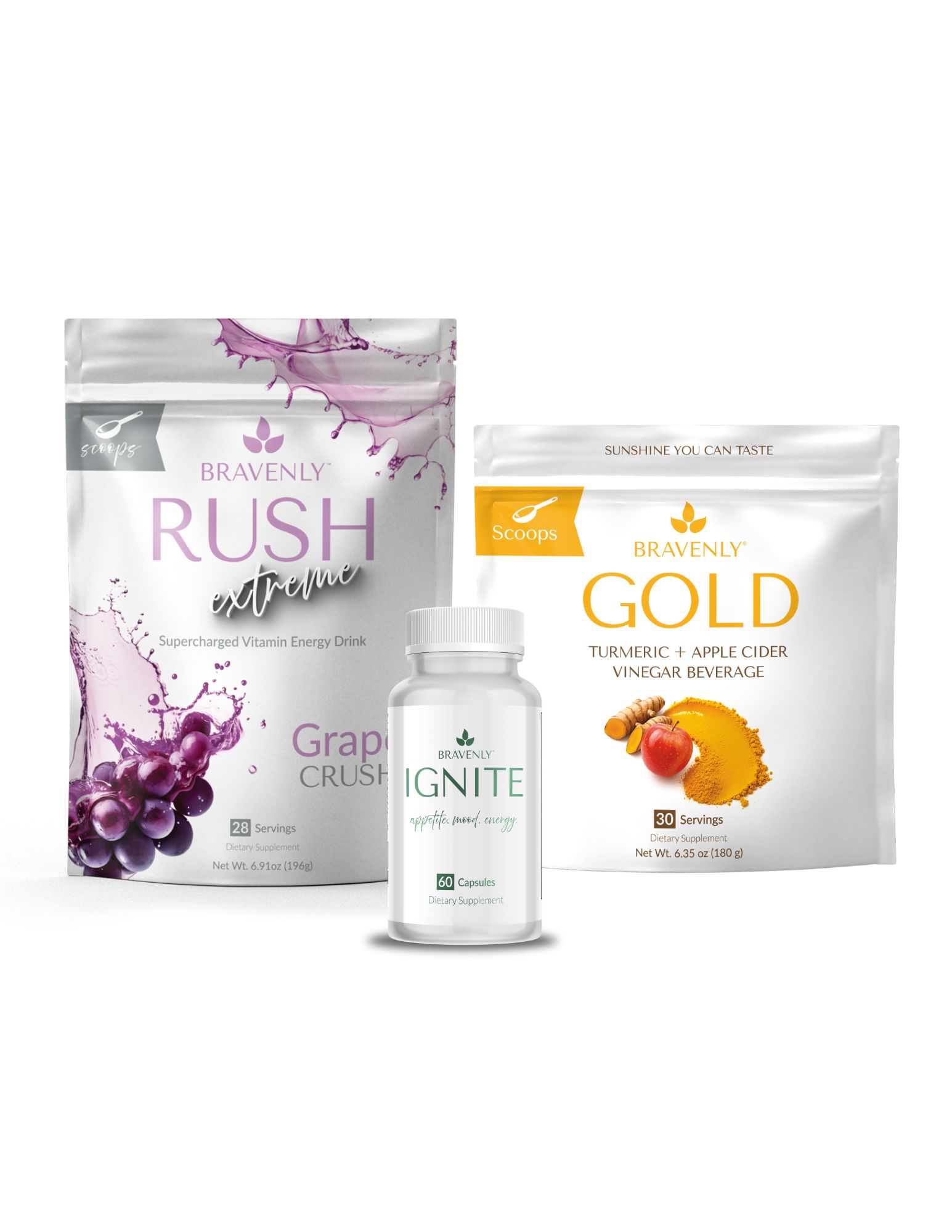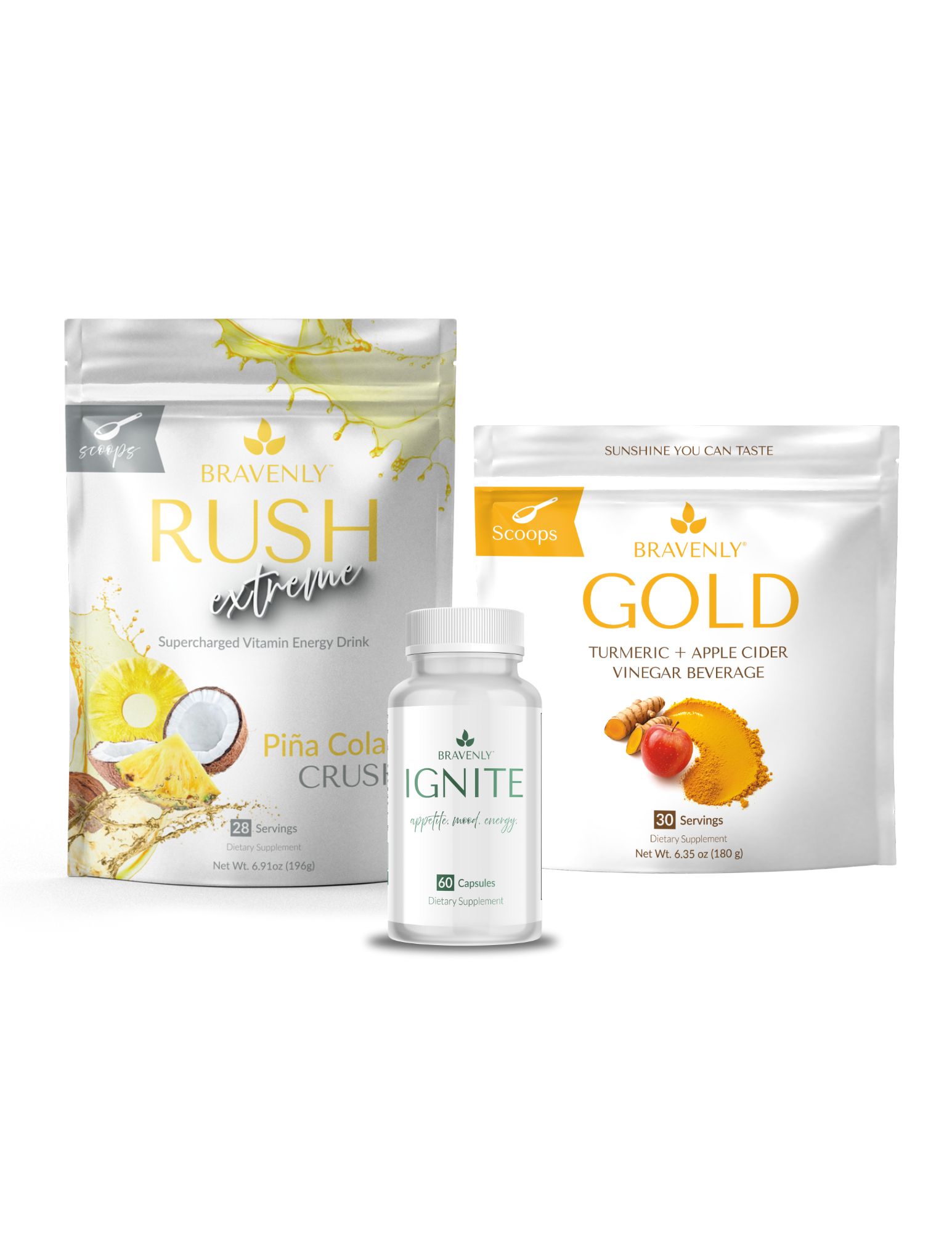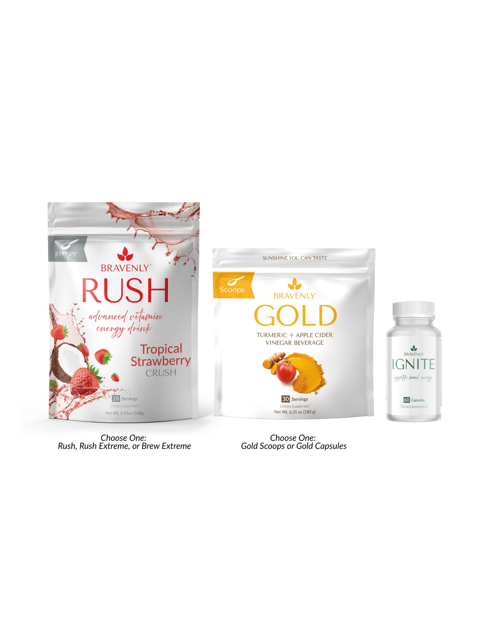 Included: IGNITE, GOLD (scoops or capsules) and your choice of RUSH, RUSH EXTREME, or BREW EXTREME