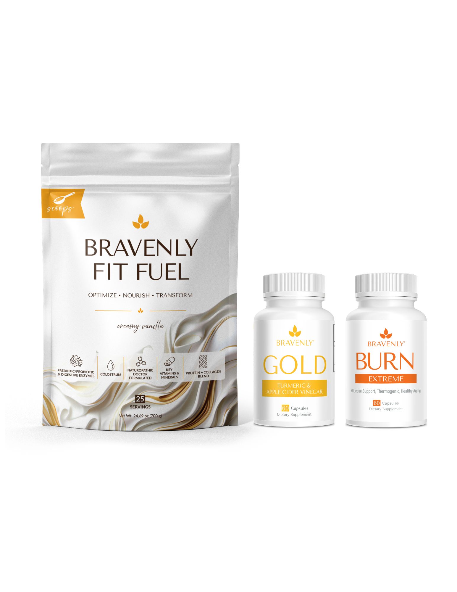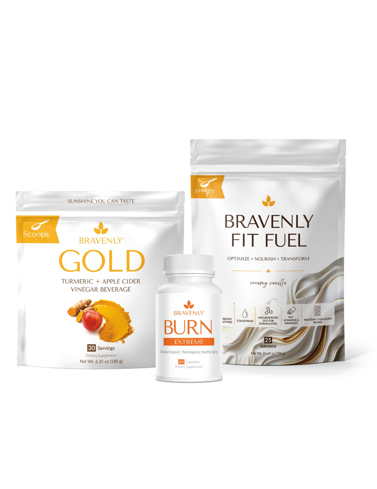 The ultimate fitness bundle! Bravenly Fit Fuel supports muscle recovery and overall well-being, Burn Extreme supports blood sugar levels, autophagy, and fat loss, and Gold supports gut health, may reduce cravings, and is filled with inflammatory properties. Together, this fitness trifecta will transform your health and body!