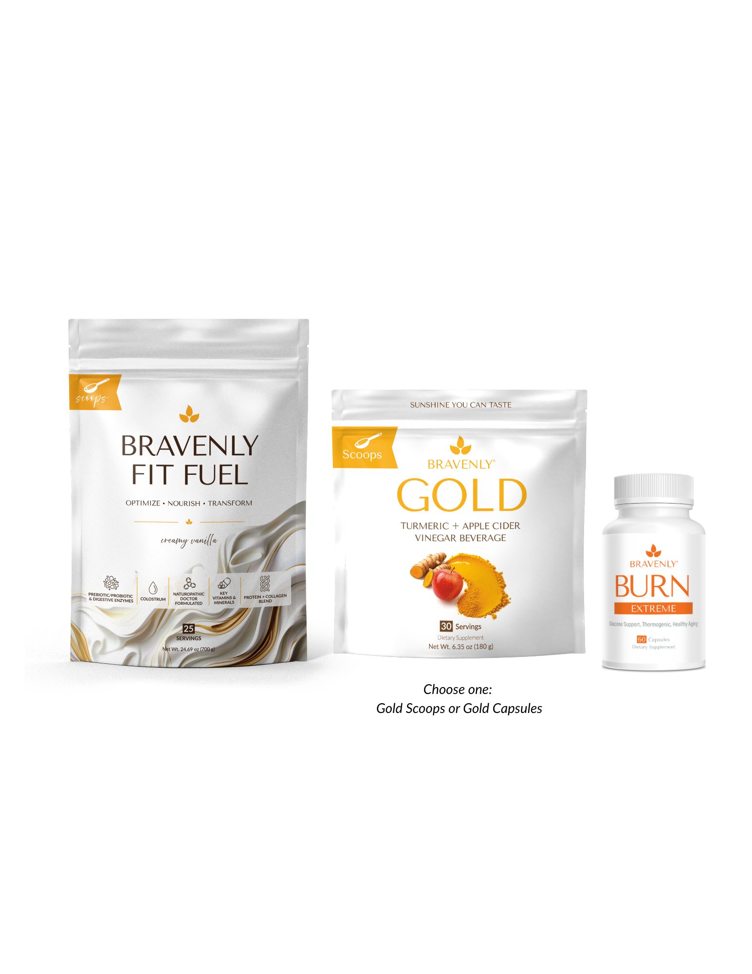 Included: Bravenly Fit Fuel, Burn Extreme & Gold (scoops or capsule)